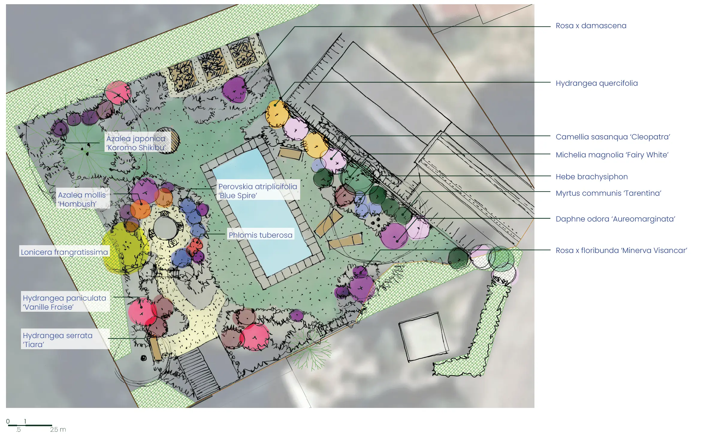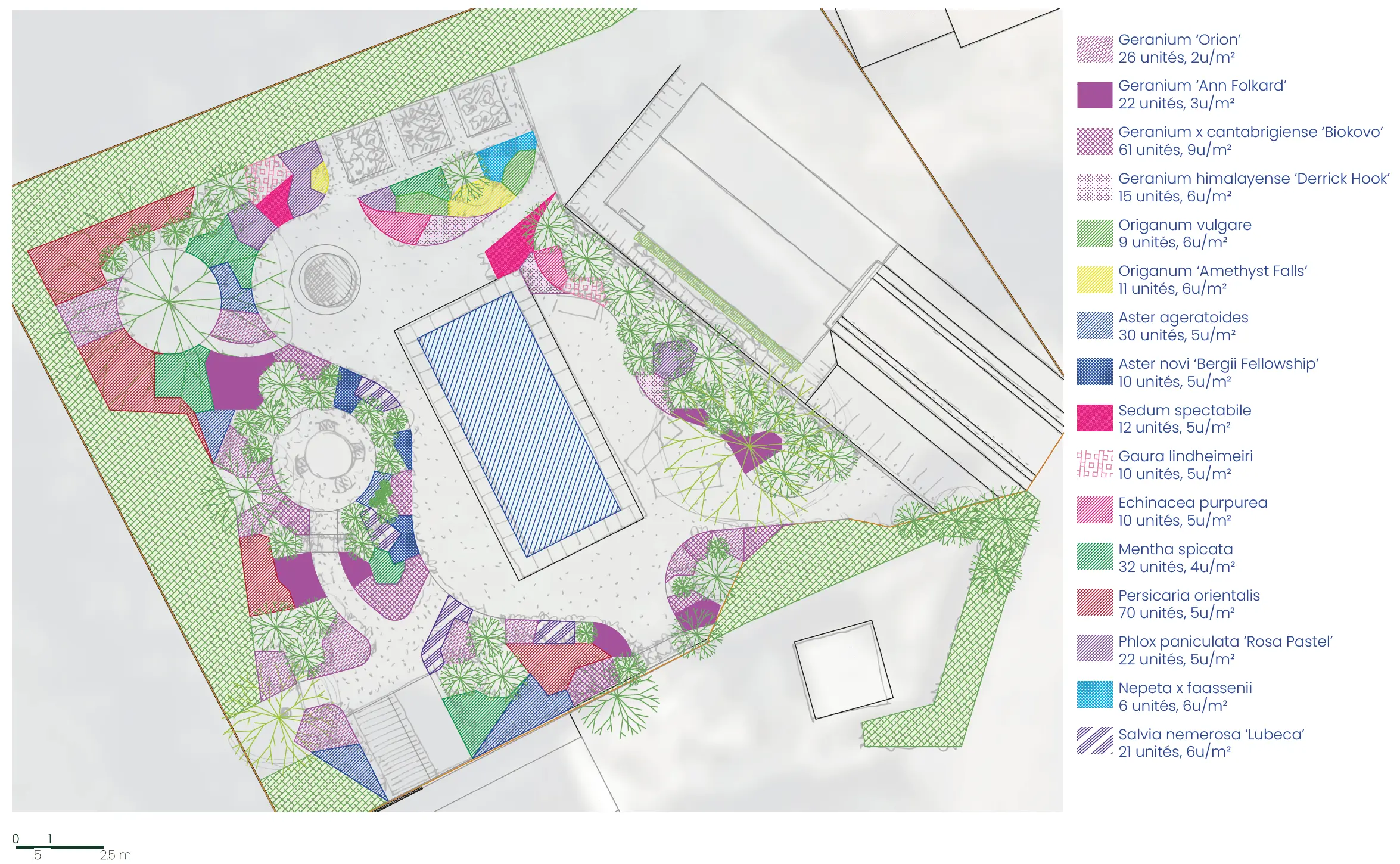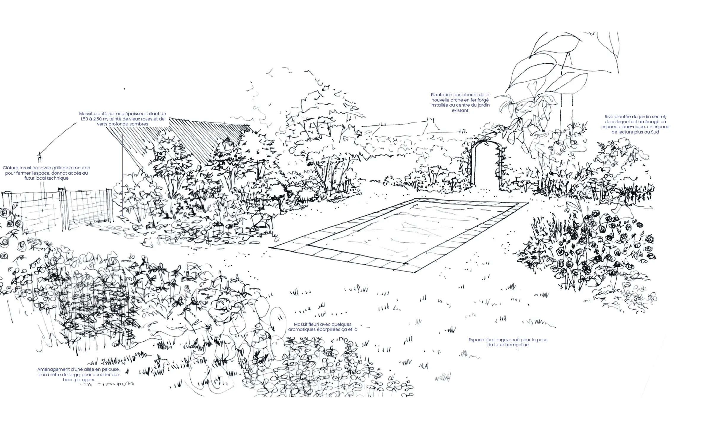 Le plan d’aménagement propose un jardin secret en limite Ouest, intimiste et fleuri, qui cache plusieurs espaces de détente :